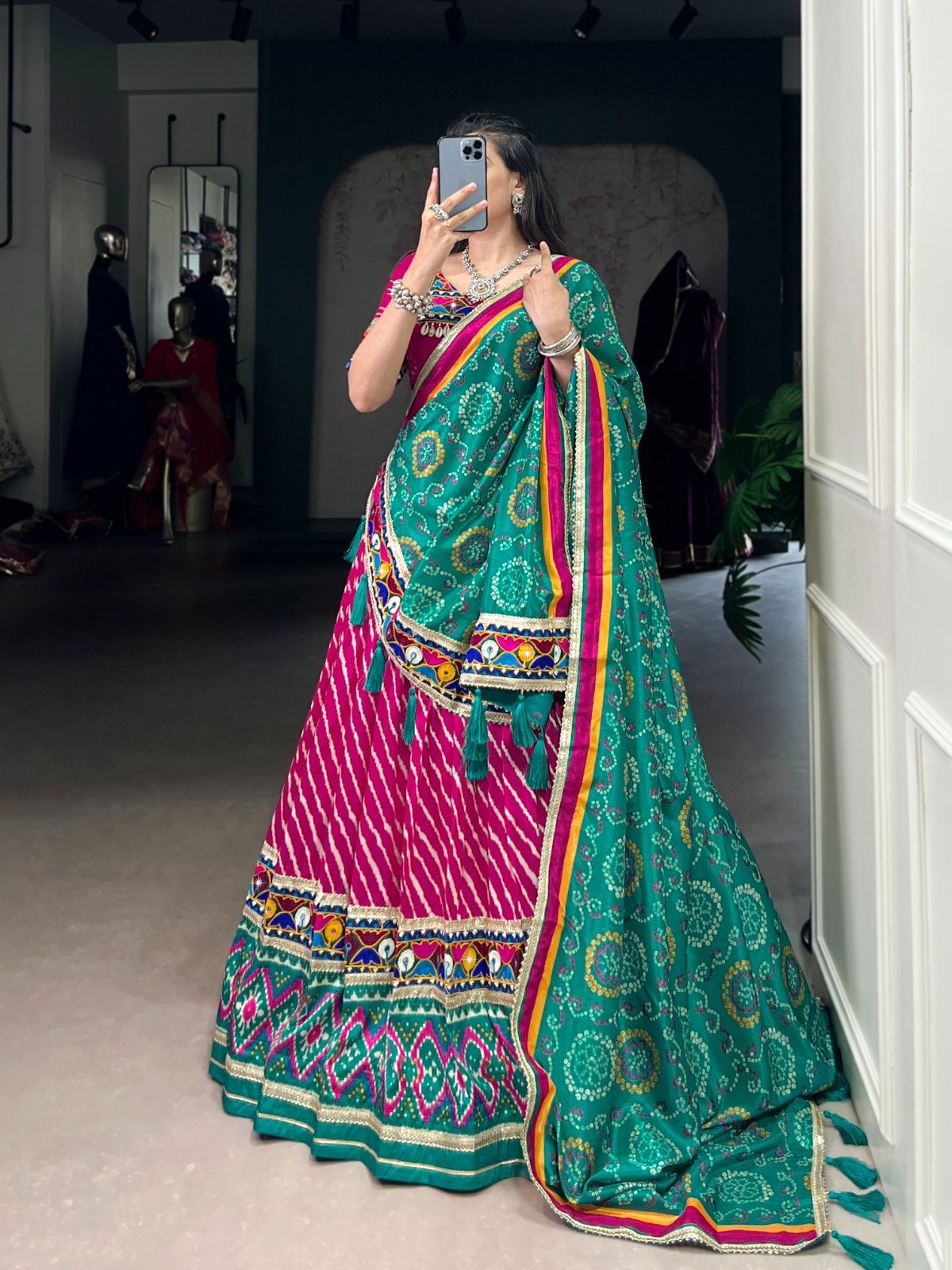 Dupatta Work : Bandhej Print And Real Mirror Gamthi Work With Lace Border Also Comes With Tassels