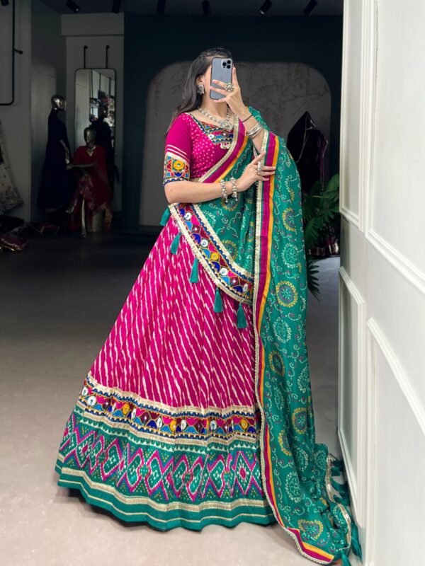 Lehenga Work : Leheriya With Patola Print Border And Real Mirror Gamthi Work With Lace Touch Up