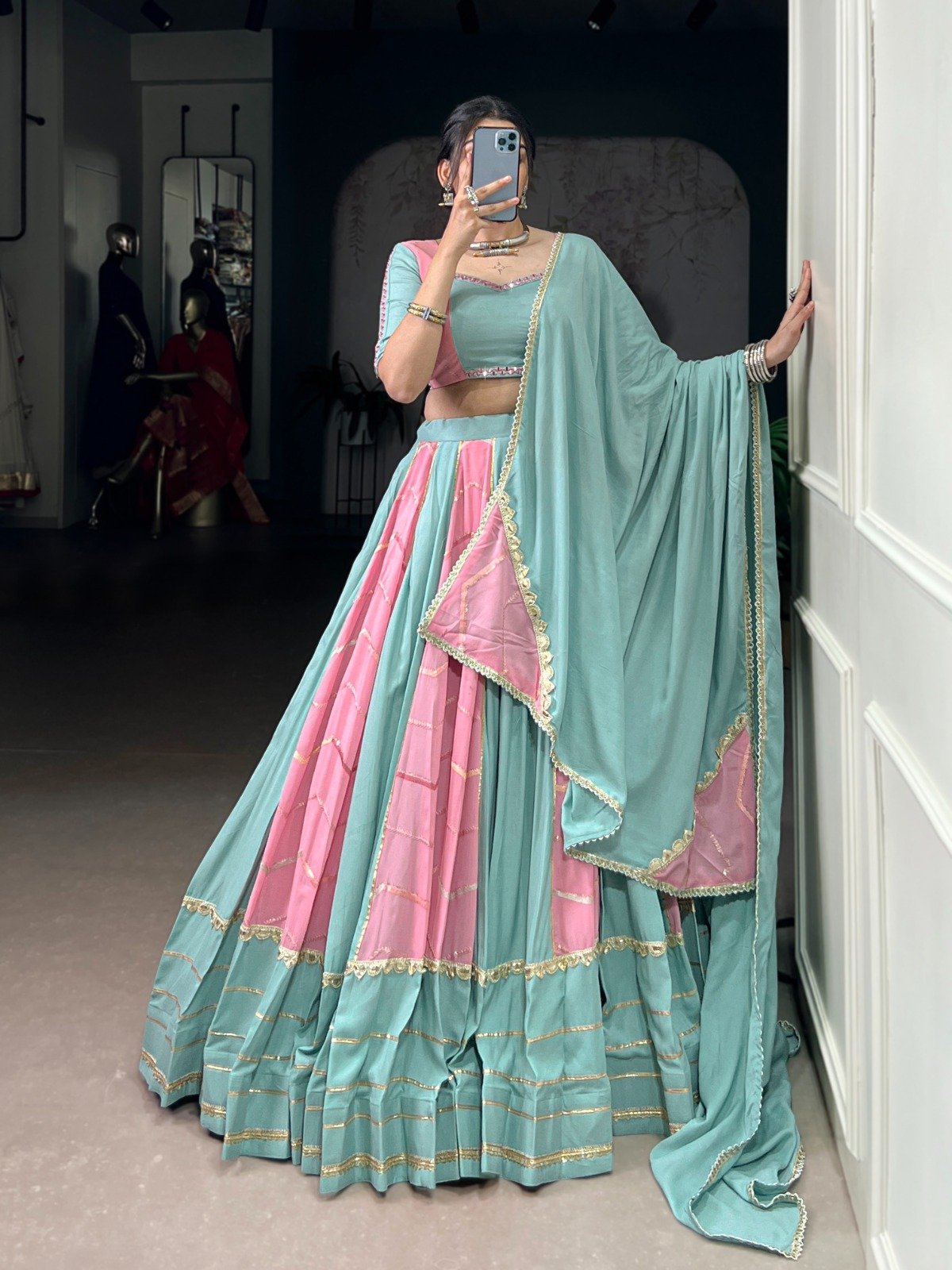 Pastel elegance meets festive tradition – this rayon with georgette chaniya choli is made for graceful Garba nights. 🌸🩵