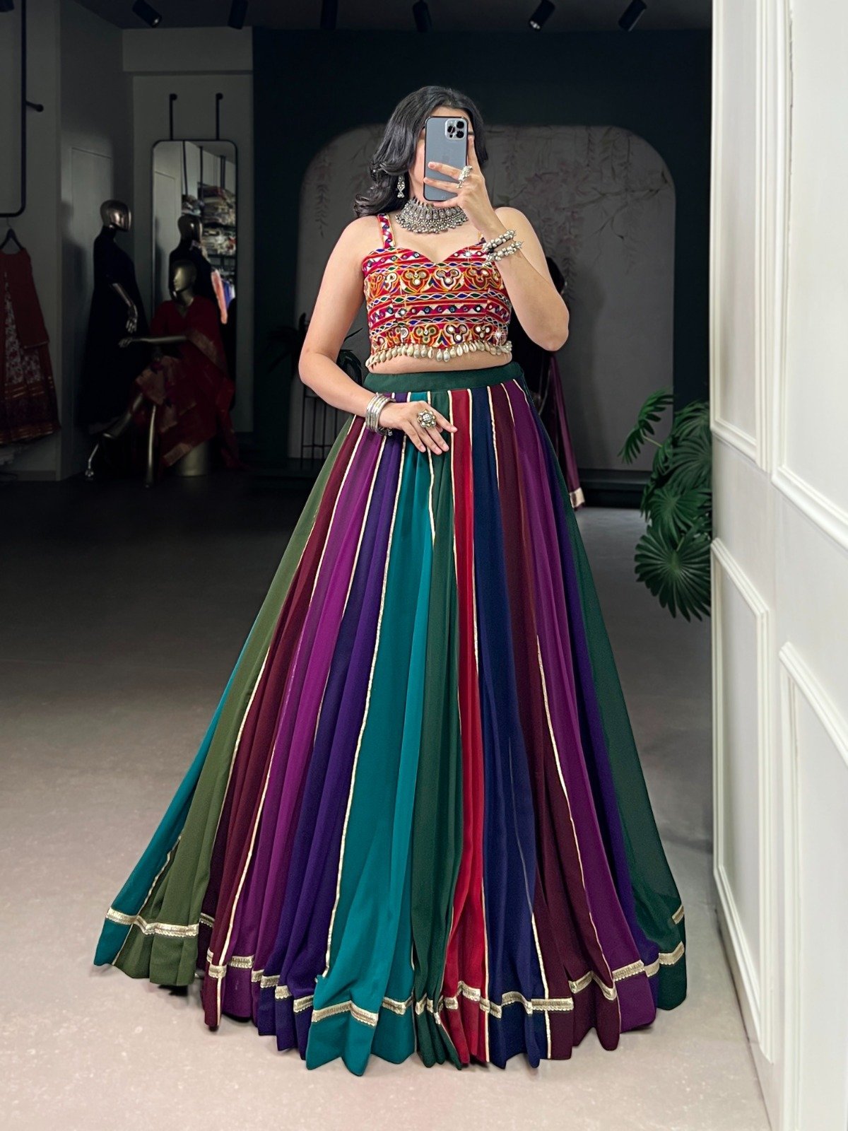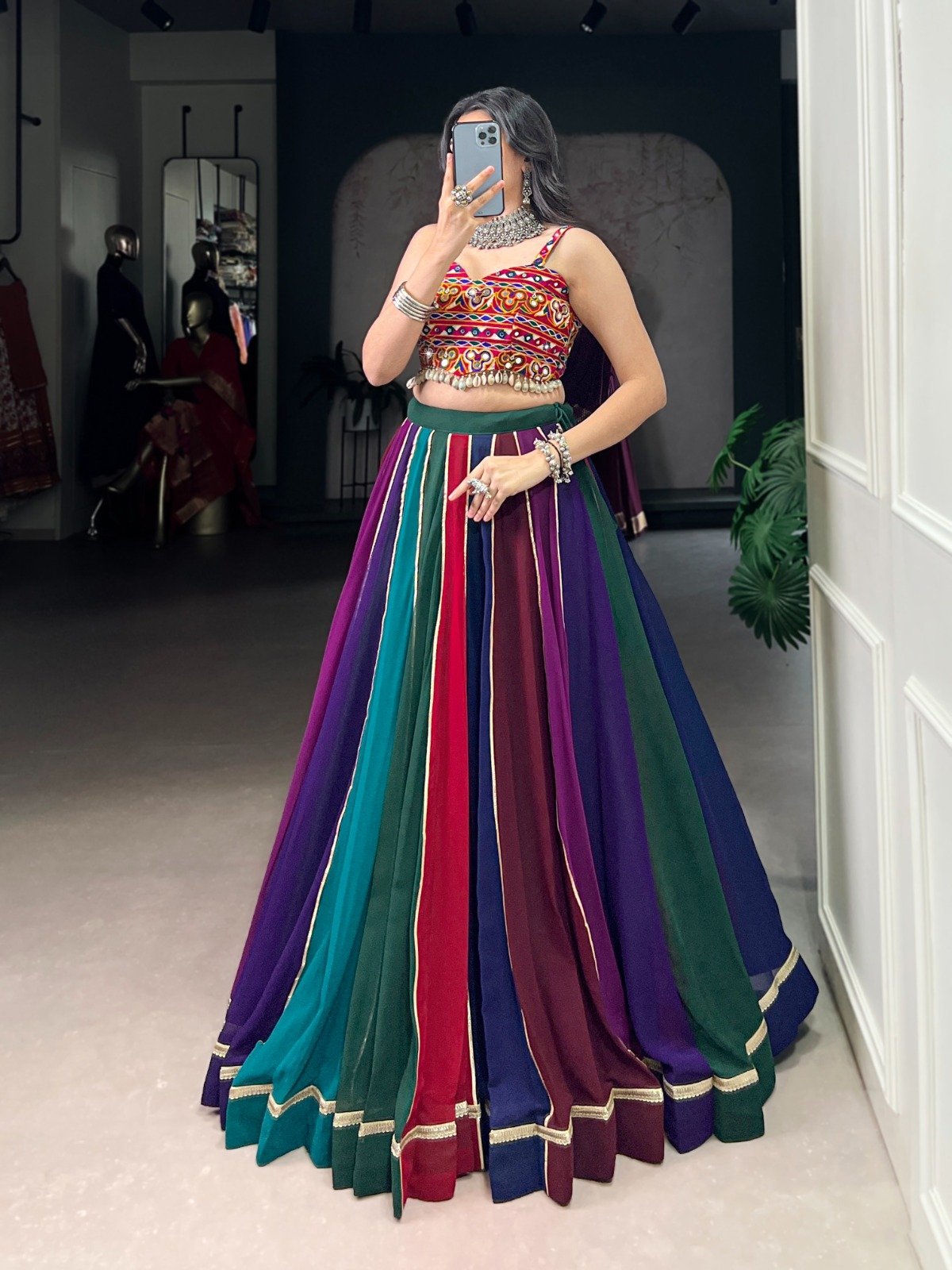 This stunning lehenga choli features real mirror Gamthi work on the blouse paired with a multi-shaded flair skirt enhanced with a delicate lace touch up🪞🌙